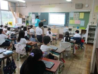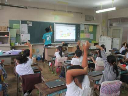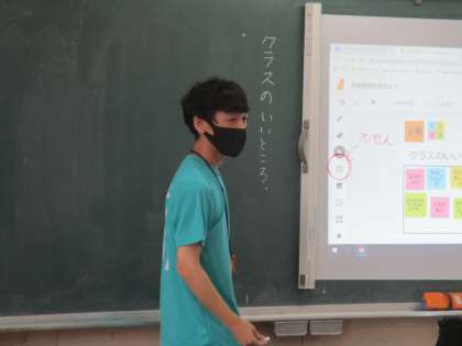 タブレットで自分で考えた学級のよいところをまとめ、その後に発表です。