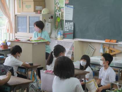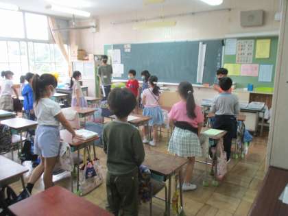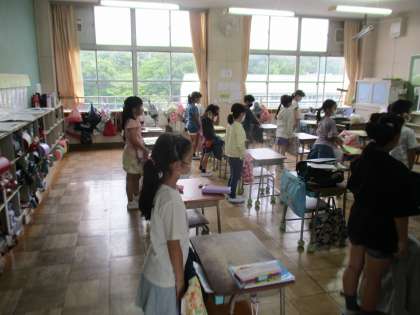 3年生の朝の様子です。校庭での集会から教室に戻って、先生の話や出席の確認が始まりました。