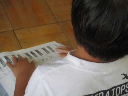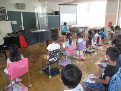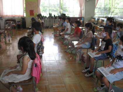 音楽です。鍵盤ハーモニカの学習でした。鍵盤がプリントされており、それを使って学習が進みます。