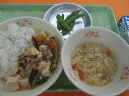 7月8日の給食 公開日 2021/07/08 更新日 2021/07/08 給食室より 8日のこんだては、 ・ごはん ・豆腐うま煮 ・トマトとたまごのスープ ・枝豆 ・牛乳 です。 今日は、今が旬の「枝豆」を食べます。枝豆は、熟してカラが茶色くなると大豆です。そのことから、「野菜」と「豆」、両方の栄養があります。 いいね(0)