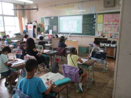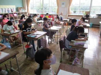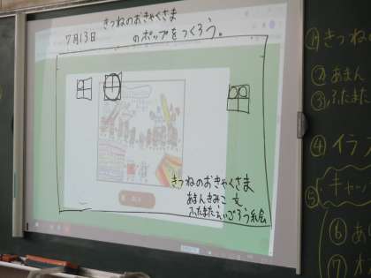 国語です。「きつねのおきゃくさま」のポップづくりに取り組みました。
