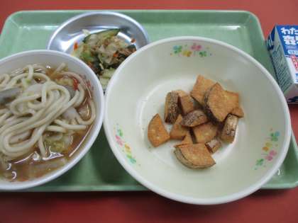 10月13日の給食 公開日 2021/10/15 更新日 2021/10/15 給食室より 13日のこんだては、 ・ちゃんこうどん ・安倍川芋 ・野菜のおかか和え ・牛乳 です。 10月13日は「さつまいもの日」です。さつまいもの旬が10月ということや、良いところが13もあることから、10月13日になったといわれています。旬のさつまいもを味わいましょう! いいね(0)