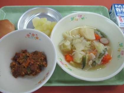 10月19日の給食 公開日 2021/10/19 更新日 2021/10/19 給食室より 19日のこんだては、 ・セルフチリビーンズサンド ・ウインナーポトフ ・くだもの(りんごの缶詰) ・牛乳 です。 今日は、「もったいない大作戦ウイーク」2日目です。食育メモには、「食品ロス」について詳しく書いてあります。「もったいない」を合い言葉に、一人ひとりが食べ物について考えてみましょう! いいね(0)
