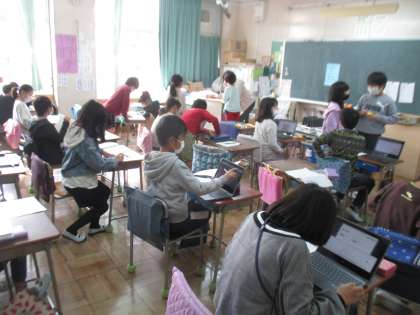 総合的な学習の時間です。社会科見学のまとめもかねて、発信の仕方を考えています。
