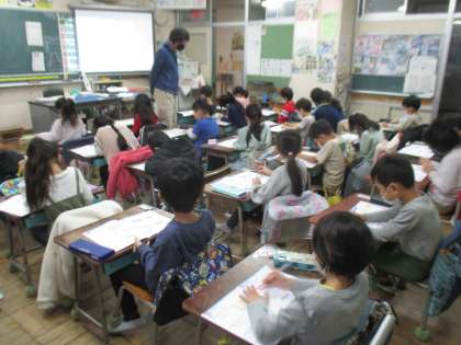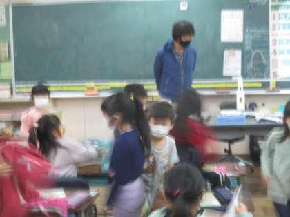 算数のドリルが配られました。下敷きをしっかり使っています。長靴もしっかりそろえていました。