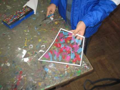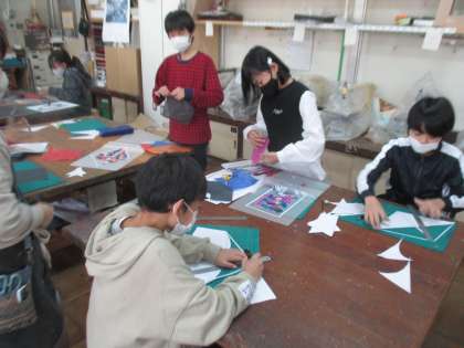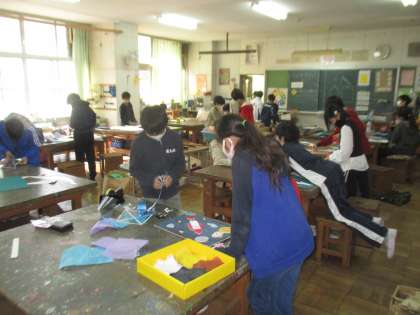 図工室でカイトづくりです。学習発表会に向けて作っています。