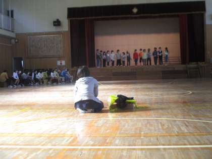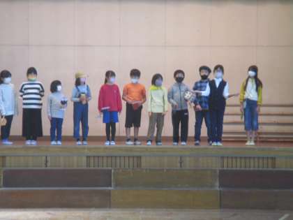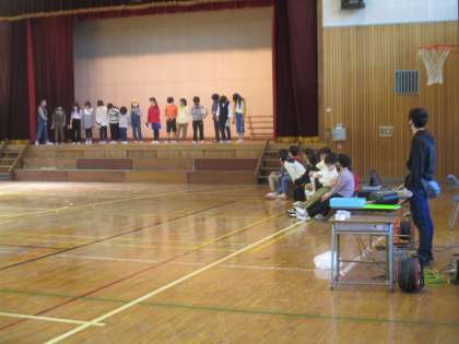 体育館で学習発表会の練習です。大きな声をだそうとがんばりました。