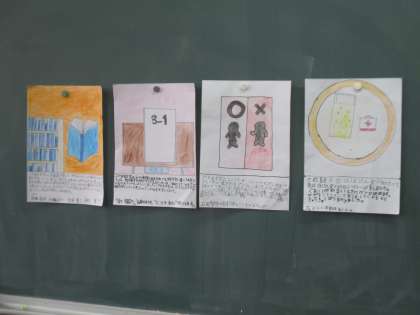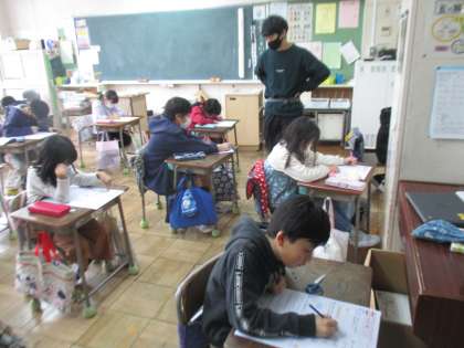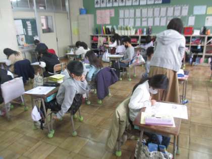 算数です。テストに取り組みました。鉛筆の音が教室に響いていました。教室の黒板には、前の時間に取り組んだ「絵文字」が貼ってありました。