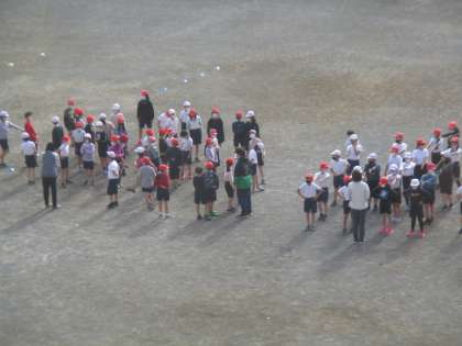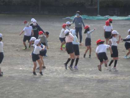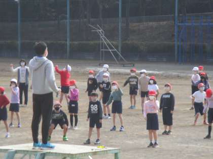 校庭に出て体を動かしました。ジャンプして回転するときに手を上手に使うとよいことなどを体験しました。
