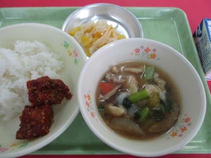 かつおの仙台みそソースがけ・・・かつおは南三陸で一本釣りや巻き網などでとれます。刺身からかつお節など加工品まで様々ですが、給食では揚げました。仙台みそは戦国大名である伊達政宗が戦のときの食糧としてみそづくりをすすめたことから広まりました。