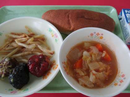 1月20日の給食 公開日 2022/01/21 更新日 2022/01/21 給食室より 20日のこんだては、 ・胚芽コッペパン ・疫病退散!Dr.肥沼ランチ ・アイントップフ ・牛乳 です。 今日は、昨年行われた、「第三回 八王子こども屋台選手権」でグランプリを受賞した、第三小学校の「疫病退散!Dr.肥沼ランチ」を給食で作ります。肉団子にドイツの国旗カラーの黄色、黒色、赤色の3色のソースを絡めてあります。それぞれの味を楽しんでください! いいね(0)