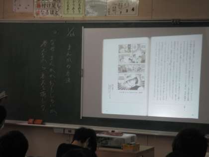 国語です。まんがの方法という説明文のCDを聞いていました。説明が簡潔にできるようになることは大切です。その学習をします。