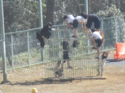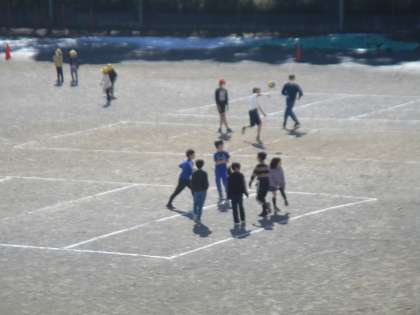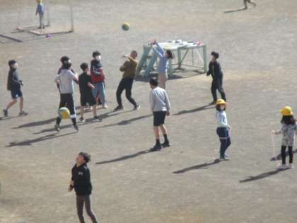 春のような陽気です。 木陰にはまだ雪が残っています。 児童は元気いっぱいに遊んでいます。