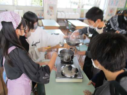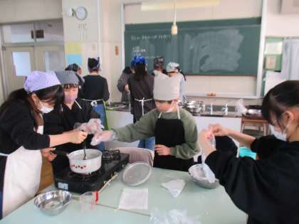 白玉粉に入れる水の分量を間違えた班が、フライパンで焼いていました。
