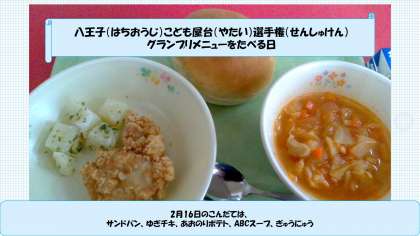 2024年2月16日の給食 公開日 2024/02/16 更新日 2024/02/16 給食室より 15日のこんだては、 ・サンドパン ・ゆぎチキ ・青のりポテト ・ABCスープ ・牛乳 です。 今日の給食は、昨年の10月に実施された「八王子こども屋台選手権」でグランプリに輝いた由木ニッシーズの考えた「ゆぎチキ」を食べます。たくさんのこだわりが詰まった「ゆぎチキ」を味わいましょう! いいね(0)