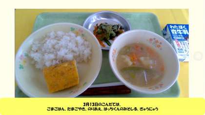 2024年3月13日の給食 公開日 2024/03/13 更新日 2024/03/13 給食室より 13日のこんだては、 ・ごまごはん ・たまご焼き ・のり和え ・はっちっくんのみそ汁 ・牛乳 です。 いいね(0)