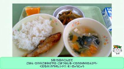 2024年5月15日の給食 公開日 2024/05/15 更新日 2024/05/15 給食室より 15日のこんだては、 ・ごはん ・鮭のごまみそ焼き ・小松菜汁 ・茎わかめのきんぴら ・くだもの(カラオレンジ1/4) ・牛乳 です。 ときどき、ごはん粒がたくさんついていることでお皿がキレイに重なっていないことがあります。お箸を上手に使ってごはん粒を集めながら食べてくださいね。「ピカピカの器」を給食室に戻してくれるのを楽しみにしています! いいね(0)