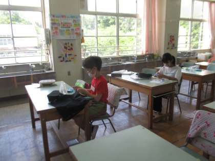 完成した児童は、ポケットティッシュケースを作っています。