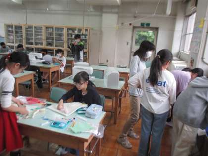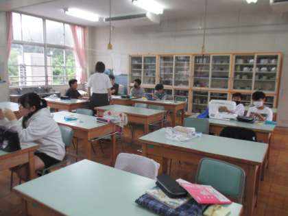 家庭科室で、トートバッグ作りの続きです。 アイロンがけは先生が見守ります。