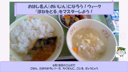 今日は、「おはし名人になろう!」ウィーク2日目です。今日マスターしたいはし使いは「骨を取る」です。魚の骨をとるコツは、身をつついて崩したりせずに「骨」をつまんで取り除くことです。正しくはしを持って、上手に骨を抜いてみましょう!