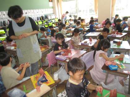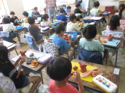 図工でシーサーを作っています。いろいろな表情があり、耳の大きさや形も様々です。
