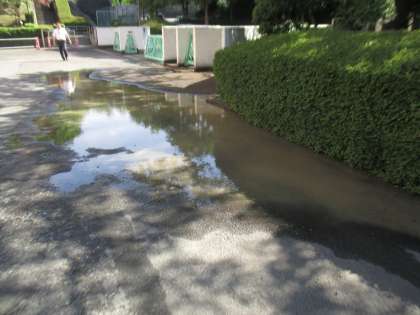 昨日の午後に、水道管の本管が破裂し、プールわきの道路から水が噴き出してしまいました。