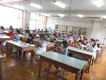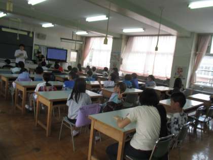 学年合同で家庭科室にいます。 道徳の授業として映像を観ます。