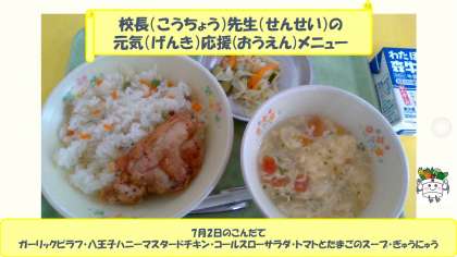 今日のハニー(はちみつ)は、八王子産です。その八王子産のはちみつを使った「八王子ハニーマスタードチキン」と「ガーリックピラフ」は、校長先生の「元気応援メニュー」です。校長先生からの「元気応援メッセージ」にあるように、しっかり食べてくださいね!