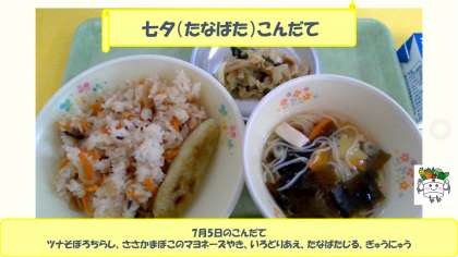 2024年7月5日の給食 公開日 2024/07/05 更新日 2024/07/05 給食室より 5日のこんだては、 ・ツナそぼろちらし ・笹かまぼこのマヨネーズ焼き ・彩り和え ・七夕汁 ・牛乳 です。 7月7日は七夕です。今日の給食では、一足早く七夕にちなんだ七夕こんだてを作りました。機織りの糸をイメージしたそうめんや星形のかまぼこ、笹の葉の緑色に色づけした笹かまぼこなどで季節を感じてください。 いいね(0)