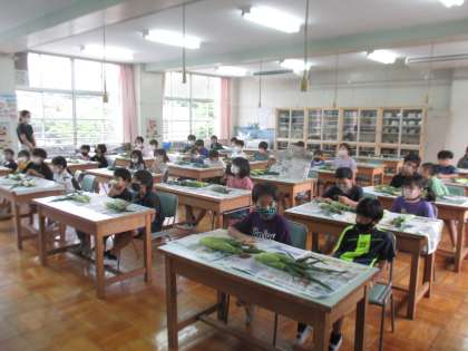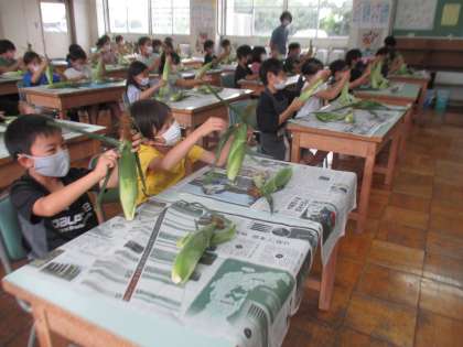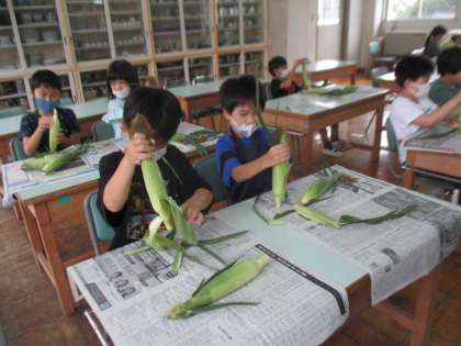 1・2組合同で、とうもろこしの皮むき体験でした。