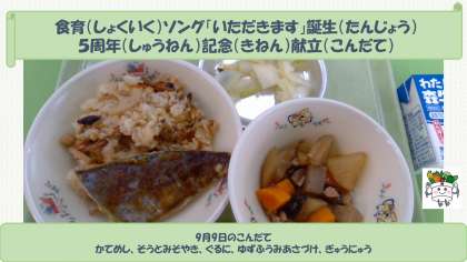 毎日のようにお昼の放送で流れている八王子市のオリジナル食育ソング「いただきます」が誕生5周年を迎えます。今日の給食では、5周年を記念して、「いただきます」の作詞作曲を担当した、フラチナリズムのモリナオフミさんの出身地、高知県の郷土料理と八王子市の料理を記念献立でいただきます。ぜひ、残さずに食べてくださいね!