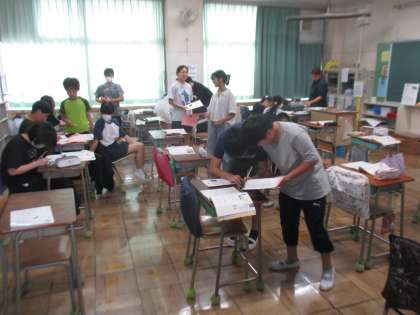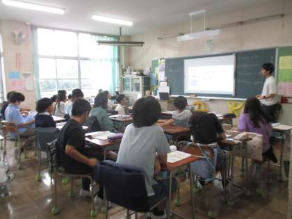 6年1組は道徳「タマゾン川」、2組は外国語の学習でした。