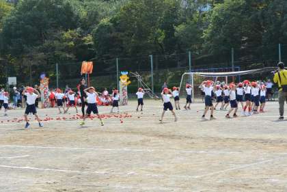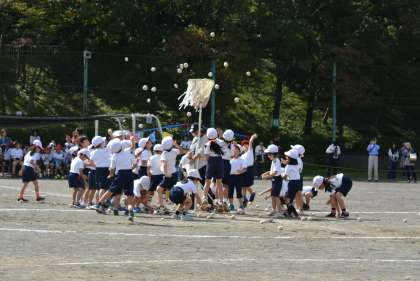 低学年のチェッコリ玉入れです。応援団も一緒に踊っています。