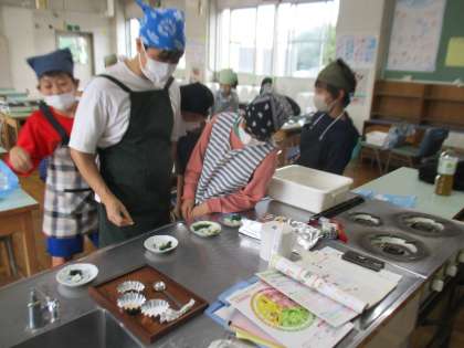 茹でた野菜を取り分けて、先生の机に持っていきました。