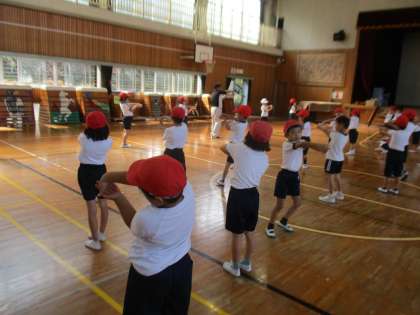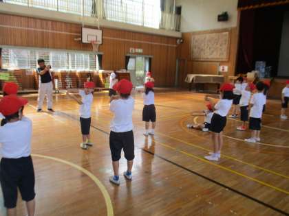 先生の説明を聞いて、準備運動をしていました。けがをしないよう、しっかり伸ばしています。