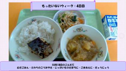 きょうは、「もったいない大作戦ウィーク」最終日です。昨日は残念ながrz、残菜の量が少し増えてしまっていました。苦手な食材が多かったのでしょうか?今日はもったいない大作戦の最後の日です。ぜひ、食品ロスを減らせるように頑張ってみてください!