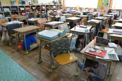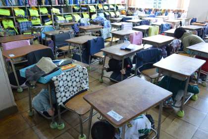 地震の訓練を行いました。1・2年生はじょうずに机の下にもぐりました。