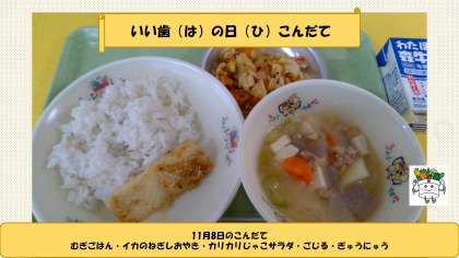 今日は、「いい歯の日です。健康な歯でずっとおいしく食事をするためには、よく噛んで食べることと食べた後にしっかり歯を磨くことが大切です。今日の給食は、いつもよりも意識してよく噛んで食べてみましょう!