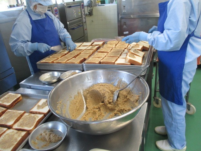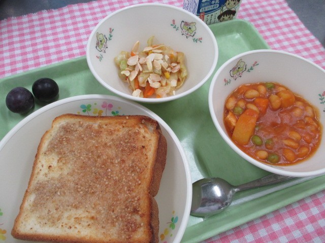 「今日は、パンの献立でした。セサミバターを1枚1枚食パンに塗って焼いていきます。高学年は4枚切りほどの厚みがありますが、子どもたちはペロッと食べてくれています。チキンビーンズも大人気でした。旬の巨峰も味わって食べてくれていました。」