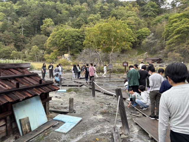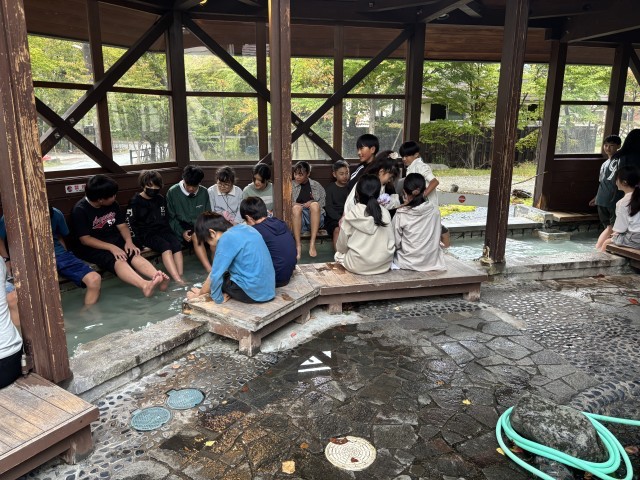 今朝、雨のため行かれなかった源泉に行きました。10円玉を無くさないようにそっと源泉に入れていました。宿に戻る途中、昨日みんなに好評だった足湯にもう一度行きました。