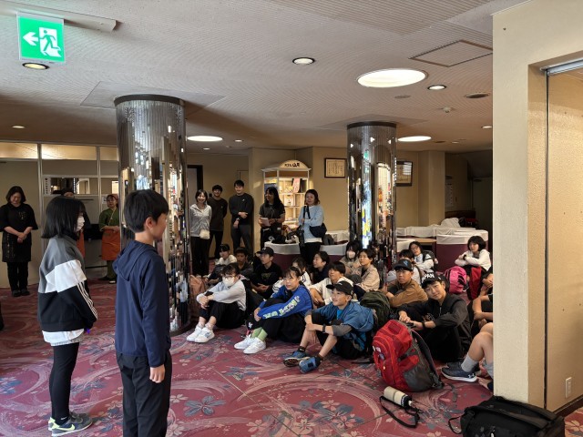 みんな元気にそろって朝の会 閉舎式を行いました。3日間 おいしい食事やお風呂 最高のおもてなしをしていただいた旅館の皆さまに感謝して宿を出発しました。