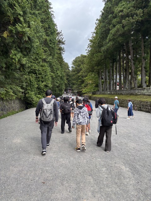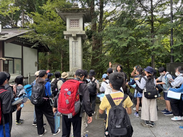 参道にある八王子千人同心の碑の前で「千人同心」クイズをしました。これから東照宮に向かいます。