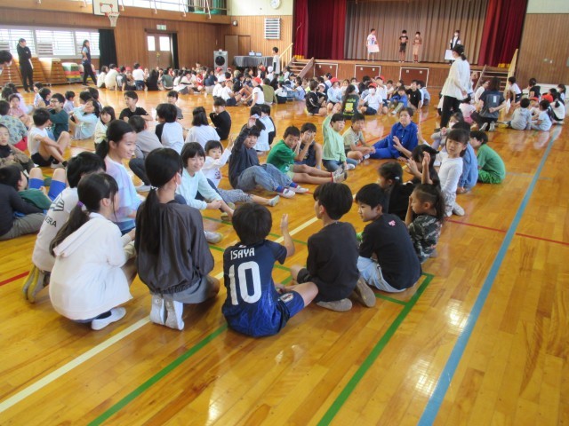 今日もいつも通りに時間までに縦割りに分かれて体育館に集合できました。