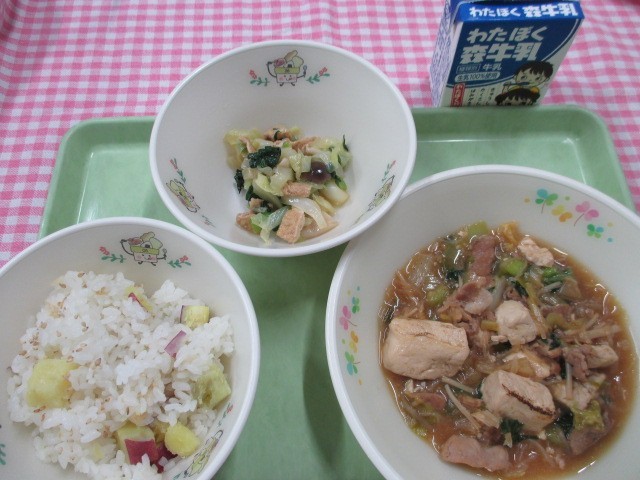 「今日は、旬のさつまいもをつかった、さつまいもごはんでした。普段、混ぜご飯は残りがちですが、今日のさつまいもごはんはよく食べてくれていました。栄養たっぷりの旬の食材を美味しく味わってもらえてよかったです。」