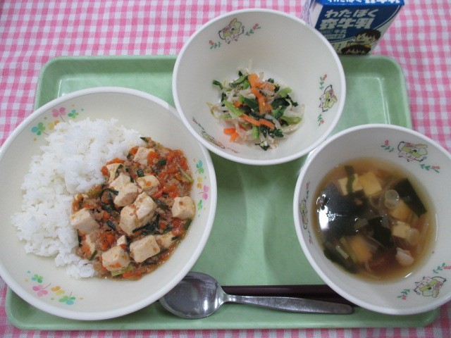 ~10月27日(月)の給食~ 公開日 2025/10/29 更新日 2025/10/29 給食室より ☆献立名☆・ごはん・おとうふたっぷりマーボー・三色ナムル・おとうふ入りわかめスープ・牛乳「今日は、図書コラボ献立ということで、絵本に出てくるお豆腐のメニューを再現しました。」 いいね(0)