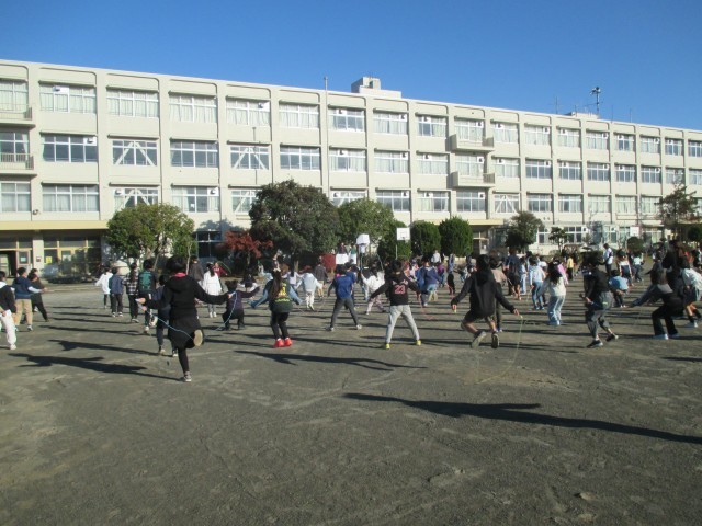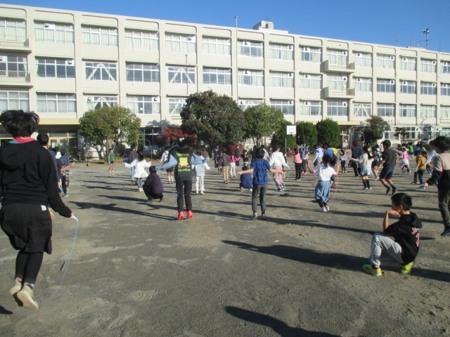 今朝の体育朝会では、今週の金曜日から始まる縄跳び月間に向けて全校で縄跳びの練習をしました。