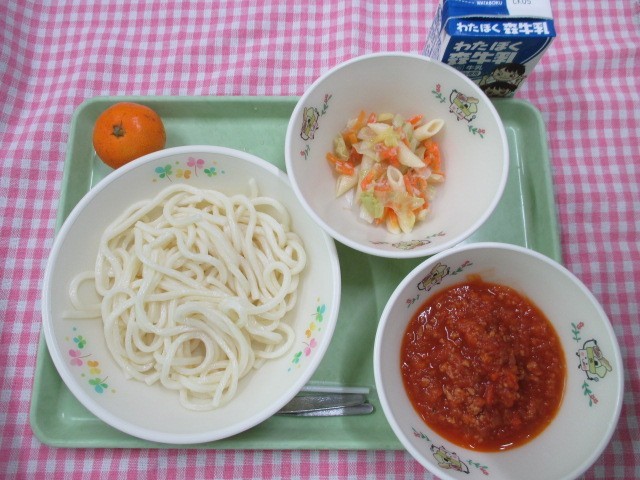 「今日は、片倉台小創立50周年の行事に合わせて、給食でも昔懐かしいメニューの「ソフト麺」風の細うどんをミートソースと共に提供しました。ソフト麺は、昭和40年ごろ、それまでパンだけであった、小麦を使った主食のレパートリーを増やすため開発された麺です。ビニールの袋に入っていて、半分に分けてからスープに入れて食べた想い出があります。子どもたちは、「こんな麺が出ていたんだね」「柔らかくてもちもちでおいしい」など、楽しんで食べてくれていました。」