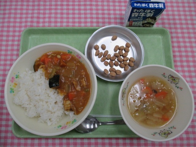 「今日は、創立50周年記念献立の第二弾でした。今では日常的に給食に出ている「ごはん」ですが、戦後しばらくは、パンや麺が主食でした。昭和51年ごろから、ごはん給食が復活し、献立にもカレーライスやピラフなどが登場しました。そのような歴史や、最近のお米の高騰なども踏まえ「ごはん」の大切さを感じてもらうメニューでした。また、食器も時代で変化しているので、今日はアルマイトの食器で少し昔を体験してもらいました。」