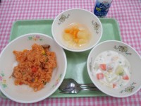 「今日は、主食・主菜・副菜・果物・乳製品の5つ揃った、5つ星献立でした!とてもよく食べてくれていて、どのクラスも残食が少なかったです。」