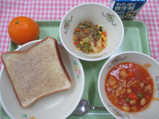 「今日は、子どもたちに大人気のセサミトーストでした。すりごま、バター、さとうで作ったセサミバターを食パンに塗ってトーストしています。じゃこサラダも人気があります。小魚を喜んで食べてくれるメニューです。」